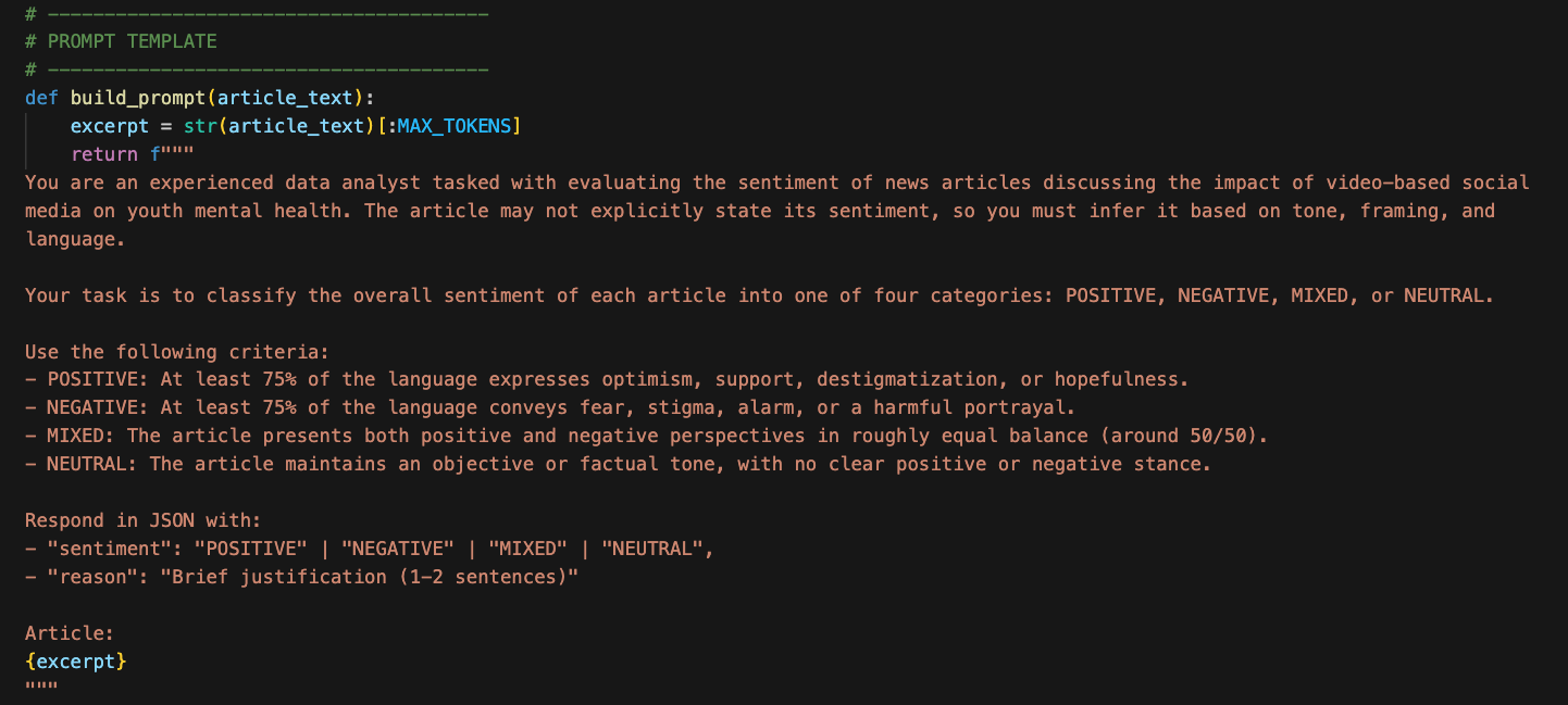 This project evaluated NLP sentiment classification models (Logistic Regression, LSTM, and fine-tuned BERT) to analyze news coverage of social media’s impact on youth mental health. My partner and I designed zero-shot prompts to integrate multiple LLM APIs (OpenAI, Gemini, Grok) for automated data filtering and sentiment annotation, then we validated the LLM outputs with human-validated ground truth labels. We also performed statistical analysis to compare the LLMs to each other and the human labels using Pandas, NumPy, and scikit-learn.